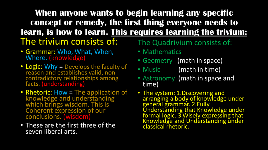 🌱This is the first and foremost class that all sovereign Americans need to master. Because, this class will teach you how to learn any subject, not just law. The trivium method of learning was created the ancient Greeks and is considered to be required learning for one to acquire a classical education. Sadly the trivium is not something that is taught in the Prussian education system any longer. https://en.wikipedia.org/wiki/Trivium The reason this most important topic is no longer taught is because it allows anyone to determine, for themselves, what is and what is NOT a fact, to then organize those facts properly by using logic, and then to teach the same to others. If this system of self teaching is allowed to be known and mastered by everyone in a society, it makes it imposable to enslave them by the manipulation of ideas, concepts, systems of law, fallacies, lies, and propaganda. This is the reason the teaching of the Trivium has been totally removed from public education in America.